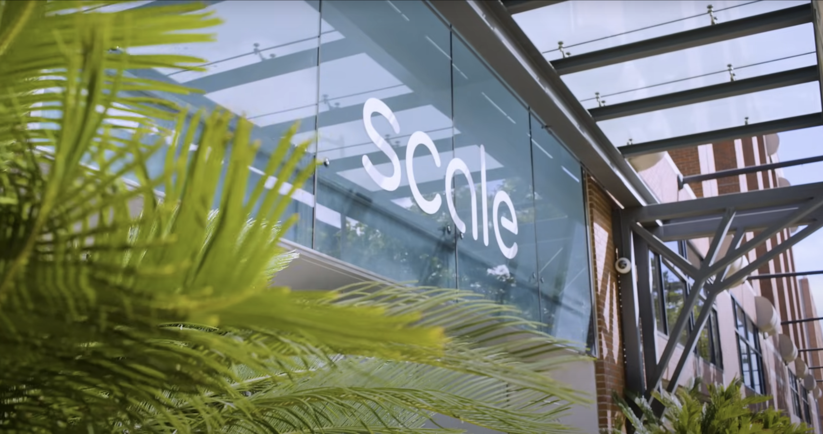 The Scale custom wordmark on the exterior of Scale's new HQ in San Francisco. The photo is from an interview between Alex Wang and Index Ventures.